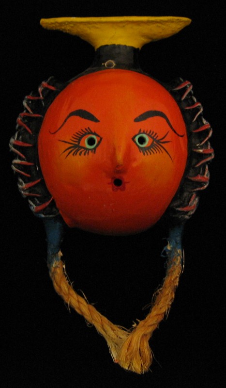 [sold]Whimsical 'coconut masks', or 'cocos', in four different Mujeres with manilla rope pigtails and hair-comb designs. The hats ?, platforms ? on top are large and stable enough to hold some small object or image. Bright, decorative little masks, roughly 8" tall, that all begin with a coconut shell. (See detail images below.) Various organic elements are plastered on, and then painted in bright colors. Very sturdy, can cheer up any room or patio. Mexico.1650