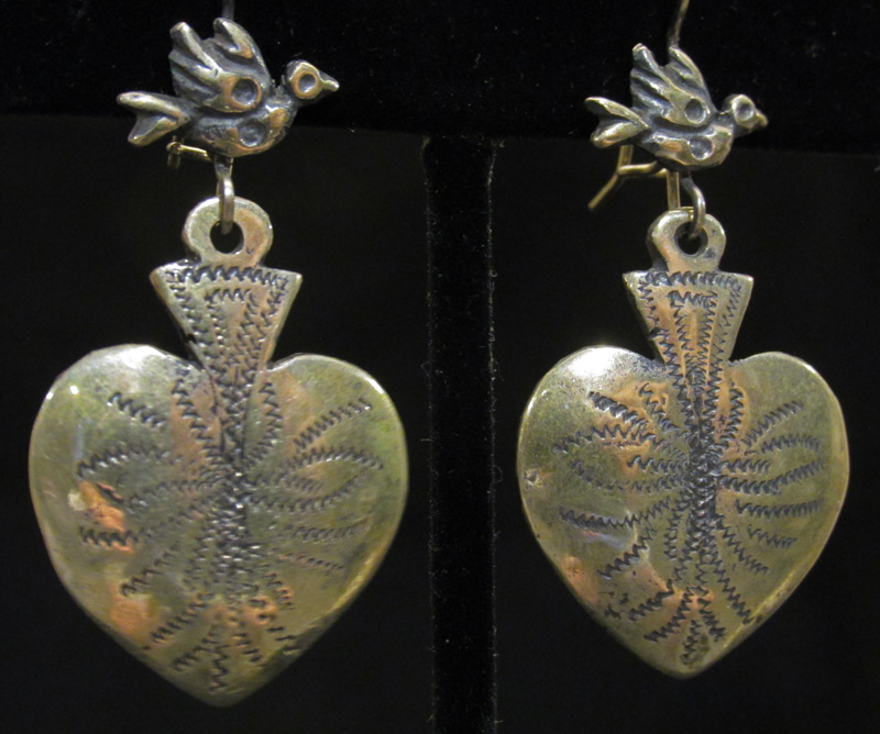 Large .925 silver heart milagro carried on the wings of a silver bird. 2" overall length, with locking french hoops. Oaxaca, Mexico.