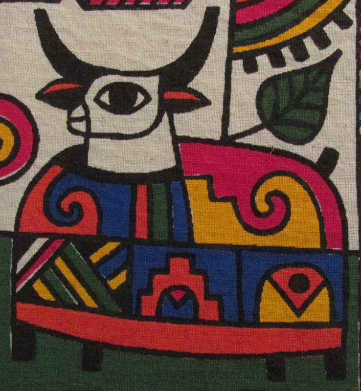 [sold] Screenprint on cotton cloth, stretched over canvas and framed in black wood. Partial version of Fernando Llort's "Universo de Mi Pais El Salvador II". 15.25" x 13.25" outer dimensions. El Salvador. ge