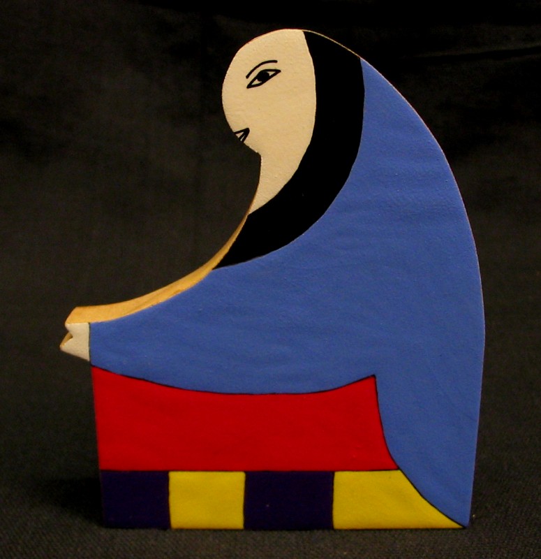 [sold]A more stylized, sideways view of a nativity from el Salvador. Seven pieces, in bright colors, range from 3" to 6" tall. Detail views below. Co-op made.be