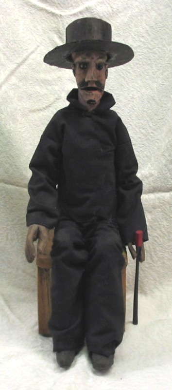 [sold] A most unusual saint, popular in Guatemala, San Simon - a.k.a. "Maximon". This one is 18" tall, carved wood with glass eyes, black cloth suit, wooden chair, cane and cardboard hat. Arms and legs are jointed at the elbows and knees. Detail views below. Guatemala.75
